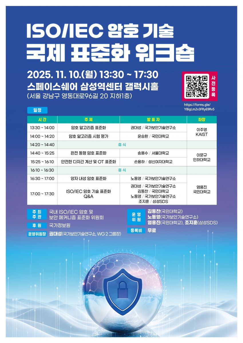 ISO/IEC JTC 1/SC 27/WG 2는 암호 기술의 국제 표준화를 담당하는 그룹으로 기존 암호 기술뿐만 아니라 양자 내성 암호, 완전 동형 암호, 안전한 다자간 계산 등의 새로운 암호 기술의 표준화도 활발히 추진하고 있습니다. 국가정보원의 후원으로 암호 기술 표준화 동향을 국내에 소개하고 우리나라가 개발한 암호 기술을 국제 표준화로 연결하는 장을 만들고자 워크숍을 개최합니다. 표준화를 추진하고 있는 분야별 전문가들이 발표하고, 국제 표준화에 관한 소통의 장을 마련하였으니 많은 관심 부탁드립니다. 등록비는 무료입니다. 참석하실 분은 아래를 참고하시어 등록해 주시면 행사 준비에 많은 도움이 될 것 같습니다. - 워크숍 명: ISO/IEC 암호 기술 국제 표준화 워크숍 - 일시: 2025. 11. 10.(월) 13:30 ~ 17:00 - 장소: 스페이스쉐어 삼성역센터 갤럭시홀 (서울 강남구 영동대로96길 20 지하1층) - 참가신청 바로가기 감사합니다. ![]() |